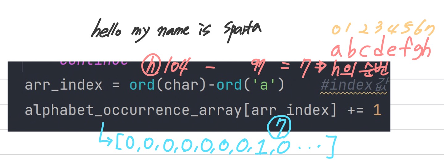 alphabet_occurrence_array[arr_index] += 1 #arr_index는 문자열의 index가 나오고 나온문자에 맞게 횟수를 늘려주기
