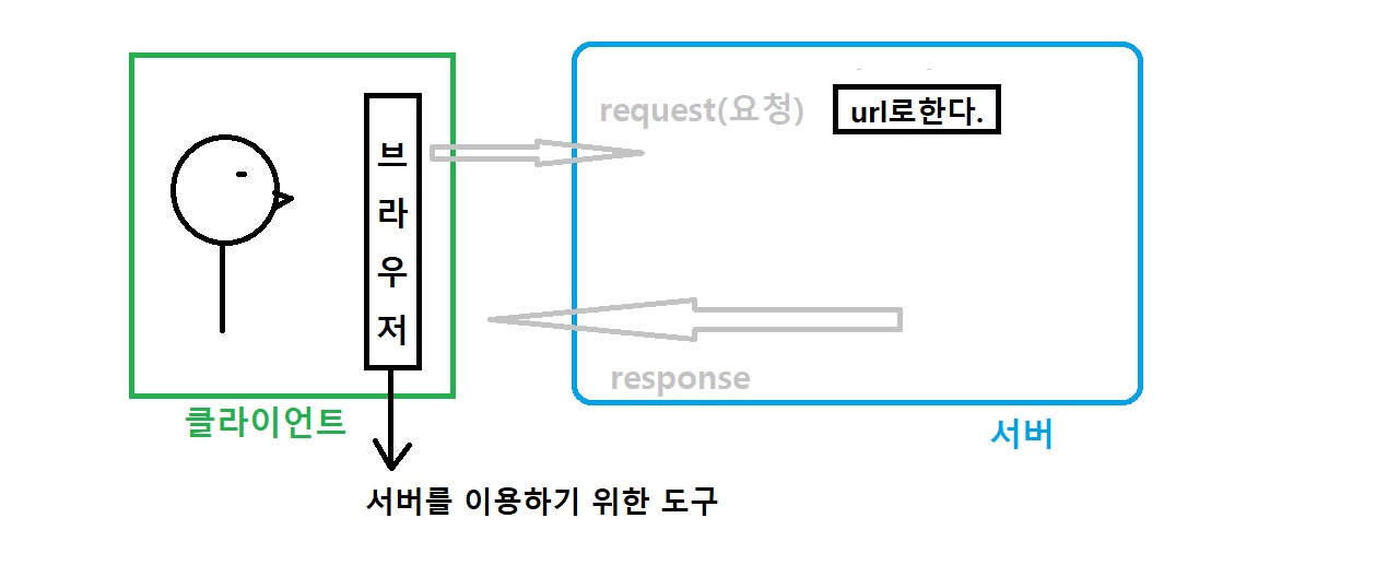 클라이언트( 나,브라우저)가 컴퓨터에 정보를 요청(request)를 한다(url형식으로 => 이게 우리의 언어...!)