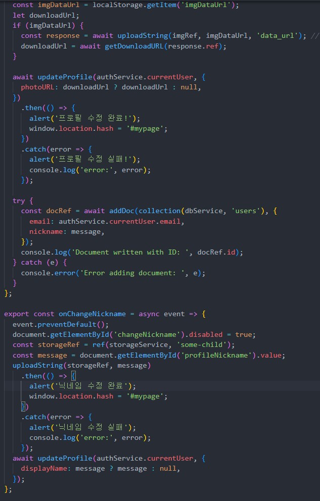 사진을 저장할 수 있는 downloadURL을 imgref를 달아서 위치를 지정해주고 photoURL을 downloadURL로 실행해주었다.
