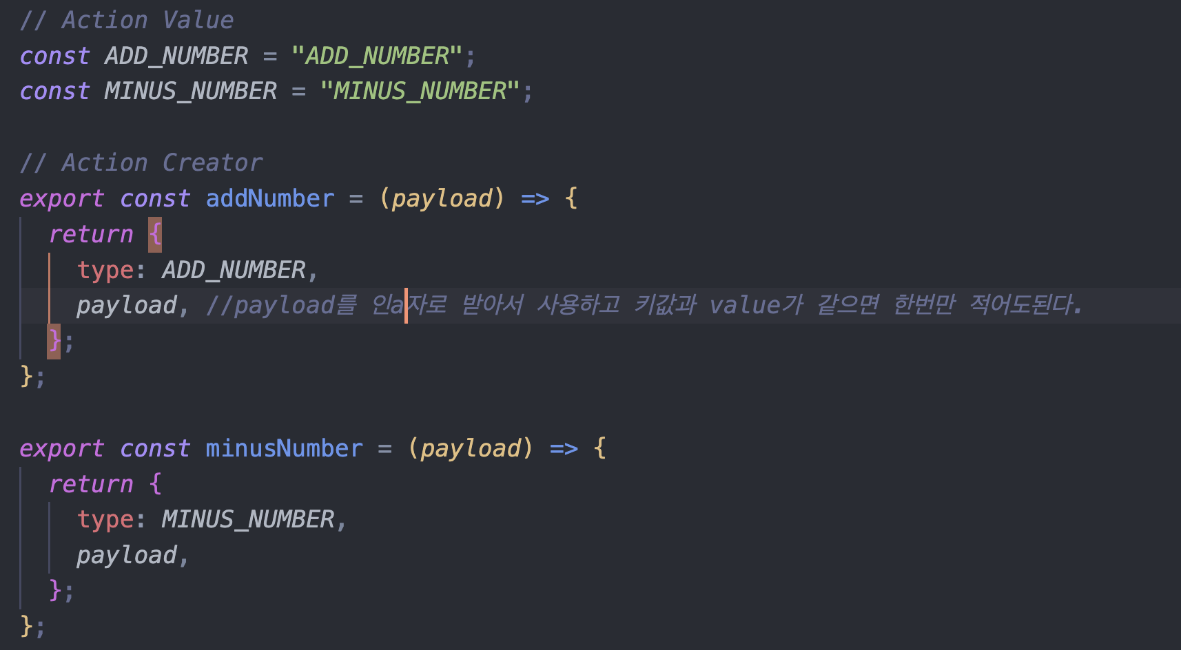 그리고 payload를 인자로 받아서 리듀서에게 넘겨줄 값을 payload으로 해준다.